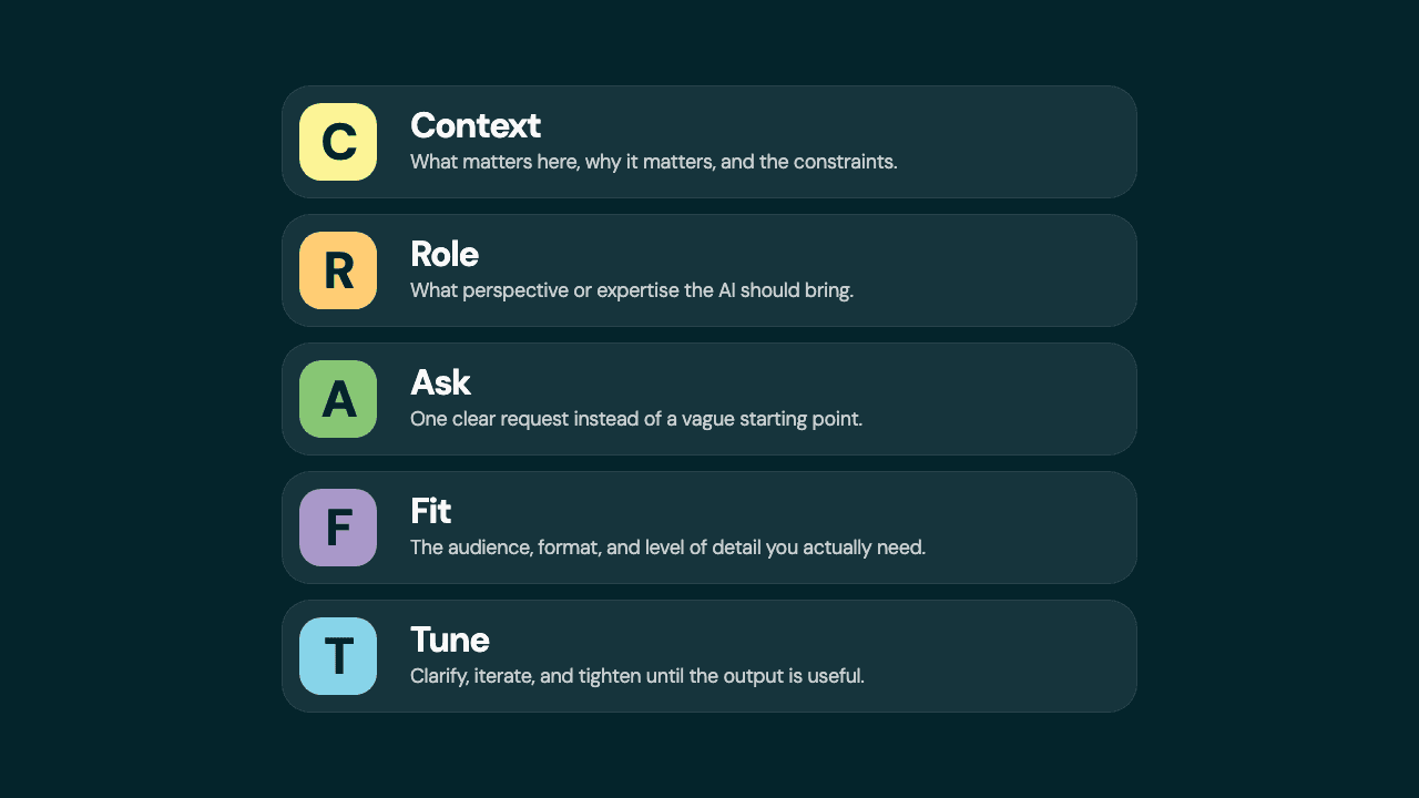 Pick one task you'd normally hand to AI with a one-line prompt. Before you send it, run through CRAFT. Add the context the model doesn't have. Set a role if the perspective matters. Make the ask specific. Tell it who the output is for. Ask it to clarify before it starts.