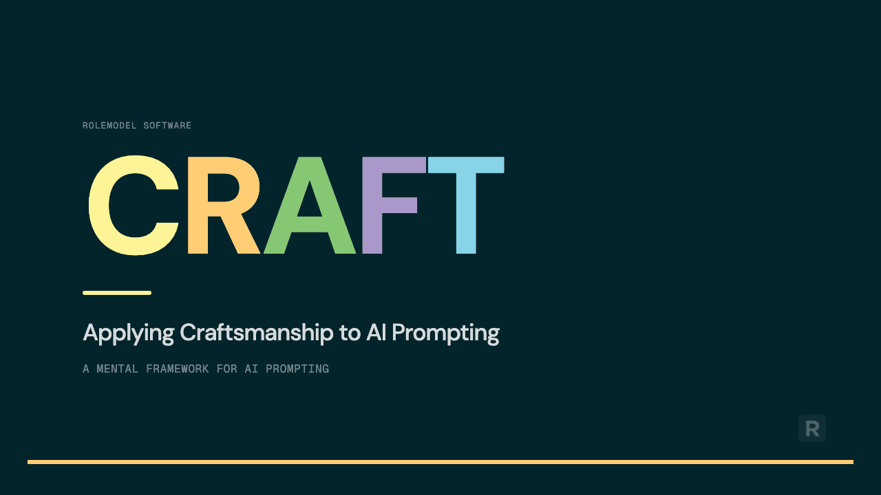 We've captured our mental model for prompting in the framework CRAFT. It's based on our experience using AI across projects and workflows throughout the business at RoleModel Software. The name is intentional. Craftsmanship means being disciplined about the work, not just getting it done but getting it right. That applies whether you're writing code, drafting a proposal, or communicating with an AI model.