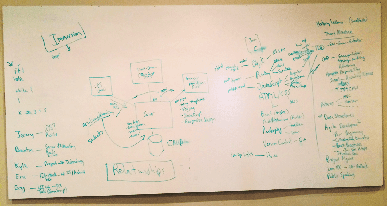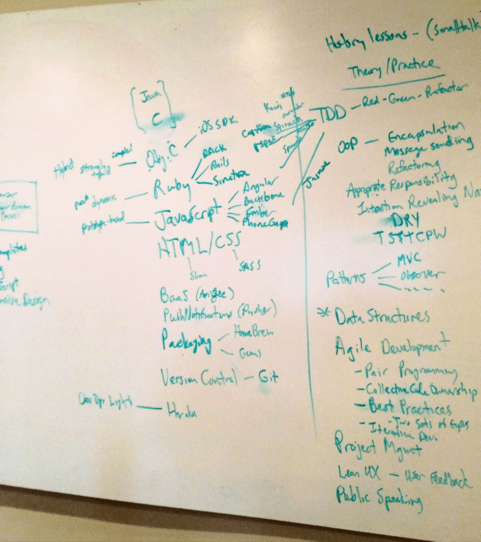 This will be a looooong article if I try to describe play-by-play all that we covered. There are a lot of moving pieces in web application development. But a short laundry list of things we learned is in order. Besides basic HTML and CSS, there are also implementation languages (Ruby, Objective C, JavaScript), templating languages (Slim, ERB, SCSS), domain-specific languages, server frameworks (Sinatra, Rails), and development methodologies (TDD, OOP, R-G-R). Oh, and databases (SQL, Postgresql), let's not forget databases. Or git. Or–nevermind. The list is too long.