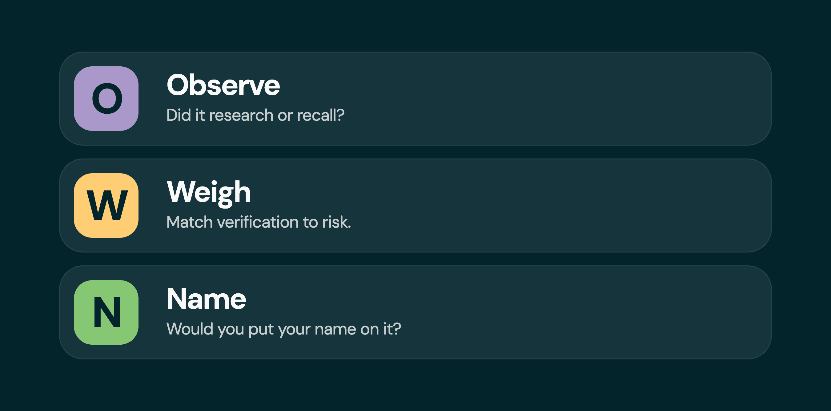OWN is the framework we use at RoleModel Software for the judgment side of working with AI. Three steps, each one a habit worth building.