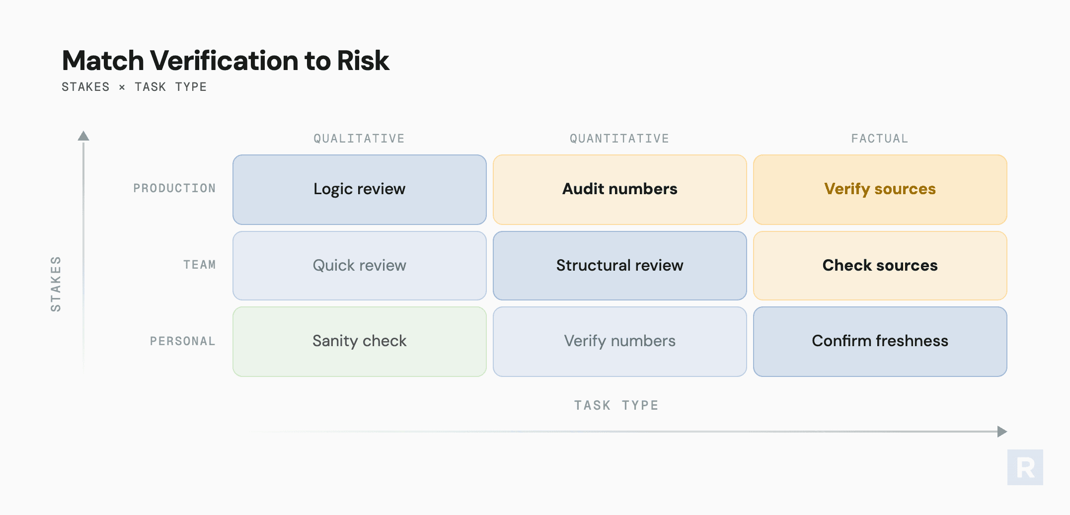 The first is what's at stake. A personal working note or exploration needs a quick sanity check. Something shared with your team needs a structural review. A production deliverable or anything affecting partners needs source verification on every claim.