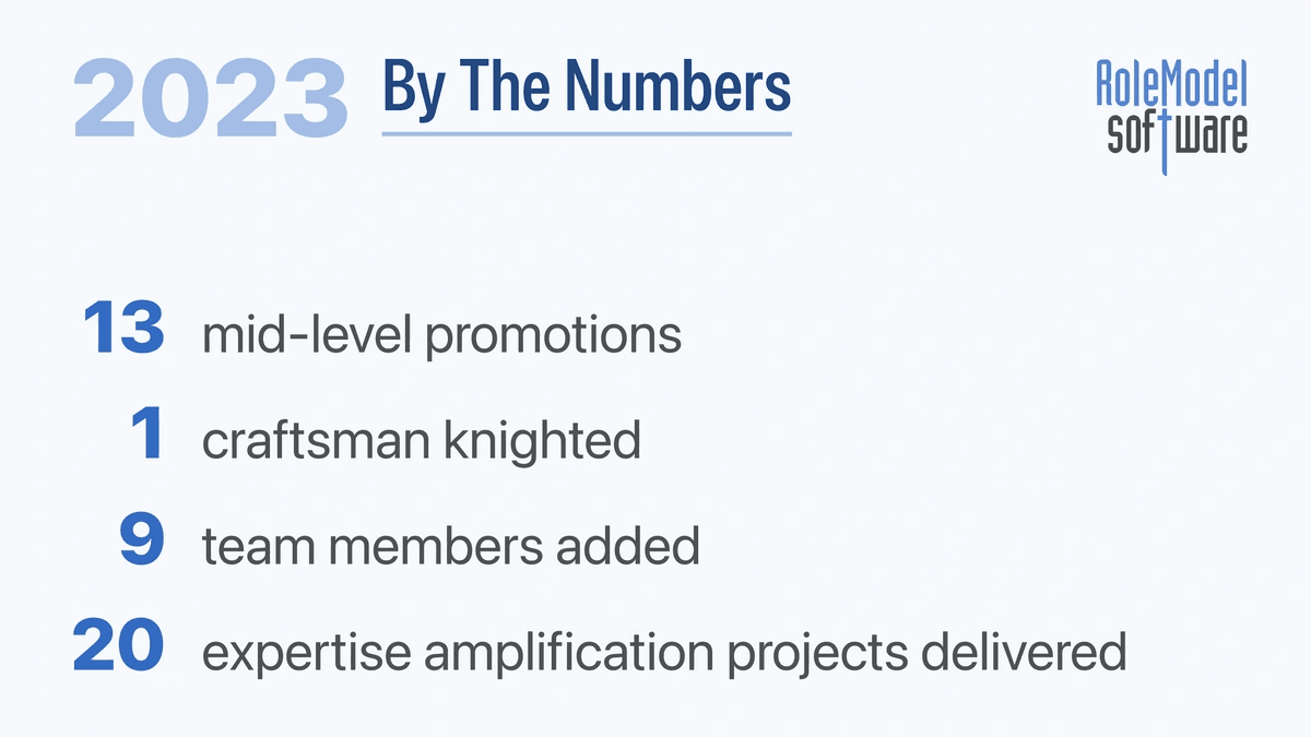 In 2023, we embraced our theme of Increasing Capacity to Serve—growing our team, guiding mid‑level developers and designers with the new Craftsmanship Radar—even knighted Sean Kennedy as a Craftsman—and delivered value through strategic CCC Day experiments and 20 expertise‑amplification projects, getting us halfway to our 10‑year goal of 100. We strengthened our culture with an impactful Asheville retreat rooted in Character, Collaboration, and Craftsmanship, and focused on partnering deeply—not just delivering software, but making a meaningful difference with the teams we serve.