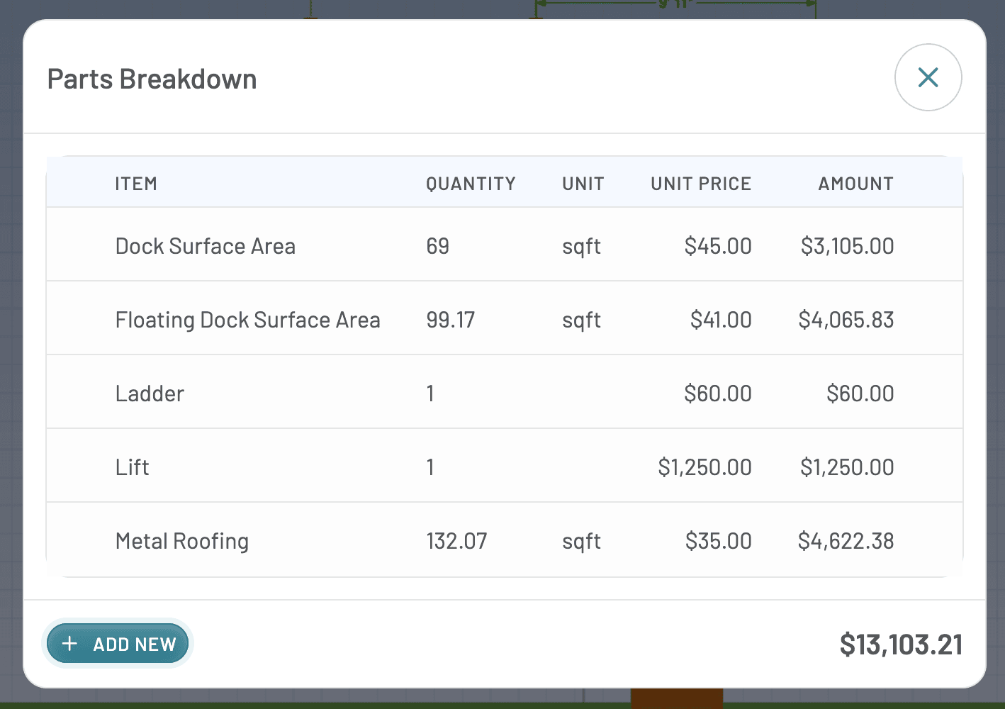 Dock Designer App makes it easy to set prices that match how each business actually works. Dock sections are priced by square footage calculations with specific unit prices set per accessories such as ladders or gangways. Custom line items can also be added to handle a number of special cases. This provides you with the flexibility to create accurate, professional quotes without requiring a custom-built system.