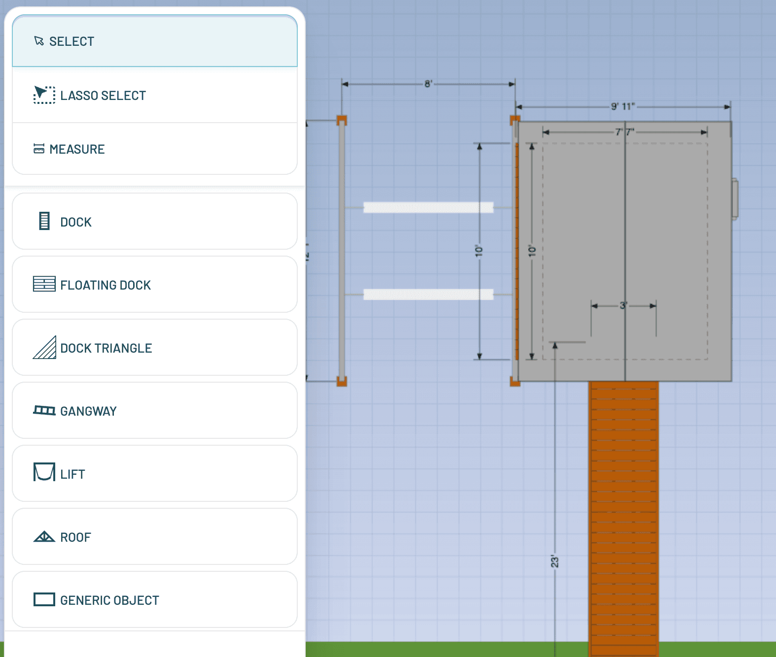 The app supports various construction styles through selectable post types, color choices, and standard accessories, such as ladders, cleats, and gangways. The ability to insert “generic objects” with custom dimensions and pricing allows users to account for site-specific constraints, such as existing structures, terrain, or customer-requested add-ons.