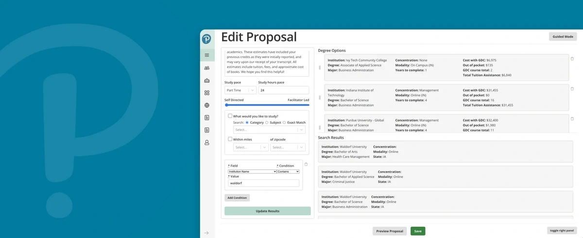 Lumerit (now Pearson) is a higher education company that uses technology and expert guidance from education professionals to help students find the right degree at the lowest cost. Leveraging a comprehensive database of thousands of colleges and academic courses, Pearson’s Accelerated Pathways assists students by analyzing student need and producing a holistic view of student options, evaluating everything from transfer credit acceptance, outside course options, target school priorities, employer tuition assistance programs, and overall program cost expectations.