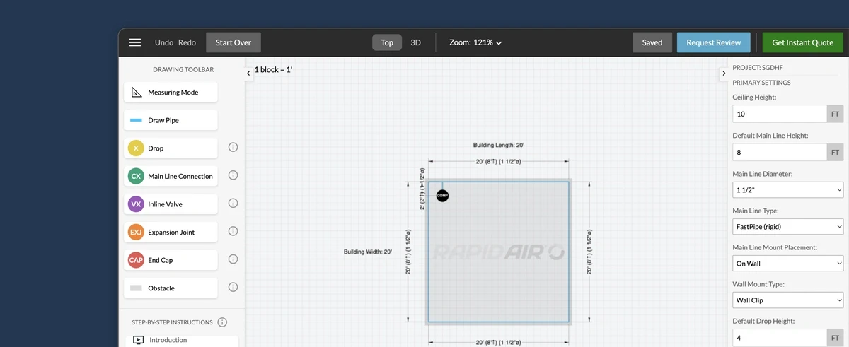 RapidAir partnered with RoleModel Software to develop a web-based 2D/3D pipe system design and estimation tool leveraging RoleModel's LightningCAD framework. The RoleModel team started by examining the existing paper-based workflow and examples of customer designs. The team then worked closely with RapidAir to explore how to build their design and estimation rules into a smooth design experience.