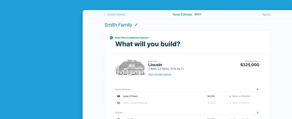 Each home floor plan has customizable options. When a customer wanted to compare options (i.e. different types of flooring), each one would have to be figured out separately. When the estimate was presented to the customer, if they wanted to swap out options, the estimate would need to be done again.
